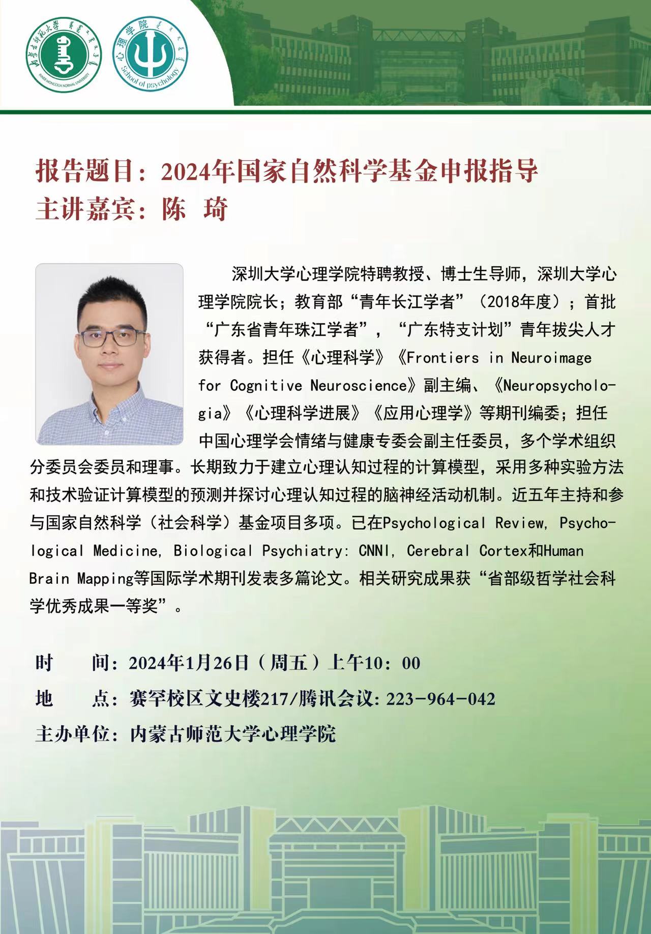 为推进2024年国家自然科学基金申报动员工作,进一步提高申报质量,1月26日,bat365官网召开2024年国家自然科学基金申报推进会,邀请深圳大学bat365官方官网院长陈琦教授为bat365官网全体教师作线上的申报指导。学院党委书记侯友、院长乌云特娜、副院长金童林及全体教师参加会议,会议由副院长金童林主持。