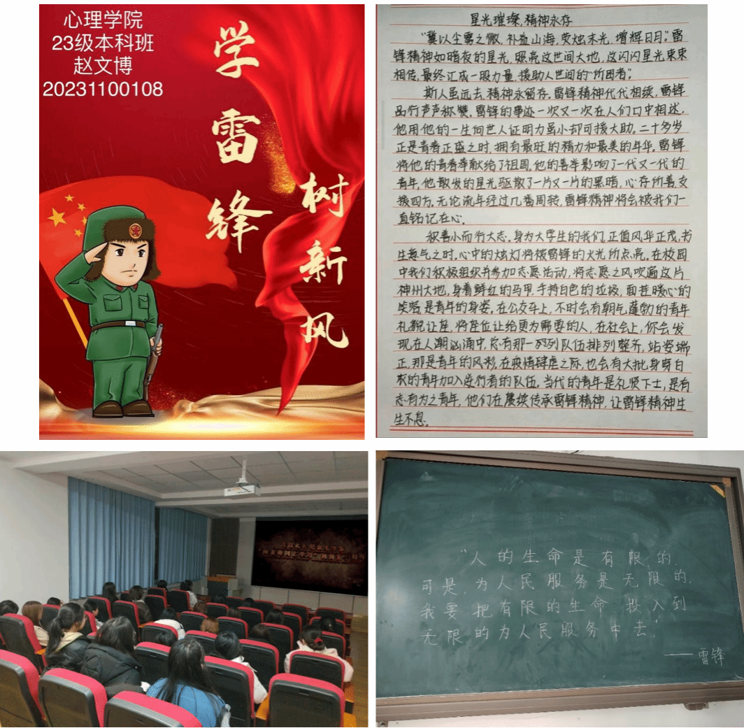 思想引领铸信念,知行合一学雷锋。春风送暖,三月芳华,为弘扬雷锋精神,践行新时代青年使命,bat365官网以“雷锋精神暖三月”为主题,开展了系列特色活动,将心理专业优势与志愿服务深度融合,让雷锋精神在校园里生根发芽,在社区中传递温暖。通过多维宣传,学习雷锋精神,组织学生赏析影片《雷锋》《青春雷锋》、组织开展“雷锋精神与我”主题演讲比赛、创意海报设计大赛、书法比赛、征文比赛等活动,以水墨丹青与现代设计融合,诠释“钉子精神”与“螺丝钉品格”、以笔为媒,书写雷锋箴言与感悟,让“奉献、友爱、互助、进步”的志愿信念扎根心田。
