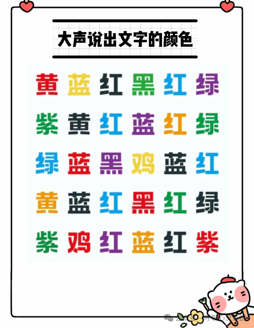 通过一场考验反应力的游戏,从心出发。根据屏幕上的颜色各异文字,选手在一分钟内迅速且大声说出每个文字的实际颜色,而不是文字本身所代表的颜色,不做emo人。