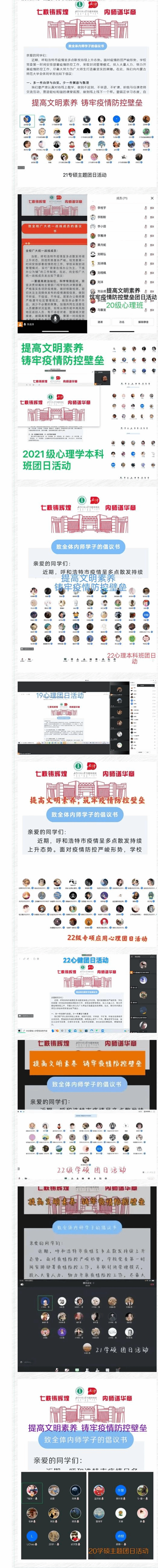 bat365官方官网各个团支部10月5日晚至10月6日通过线上形式,组织召开主题为:提高文明素养,铸牢疫情防控壁垒的团日活动。活动中首先学习了10月5日学校召开的疫情防控及安全稳定工作会议的精神和要求。同时讲清楚了当下疫情形势的严峻复杂,校园安全稳定的重要性。二是学习了学校防疫政策,学生违纪行为的危害性,科学戴口罩等防护措施的必要性,严守纪律、严格按照学校安排做好核酸检测的重要性。三是讲情怀讲温度,引导学生厚植家国情怀、爱校情怀和责任担当。疫情当下学校的领导、学院的领导、辅导员是与学生同吃同住同甘苦的。引导学生从感情上建立同理心,多一份理解多一份以身作则。四是学习了学校发给全体学生的倡议书。