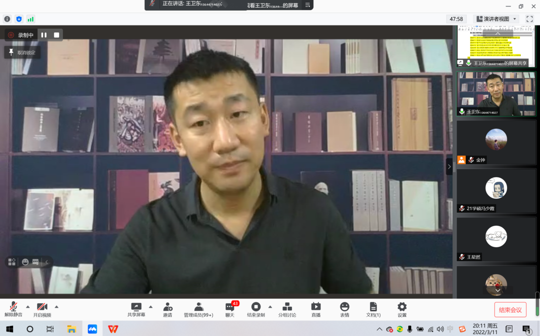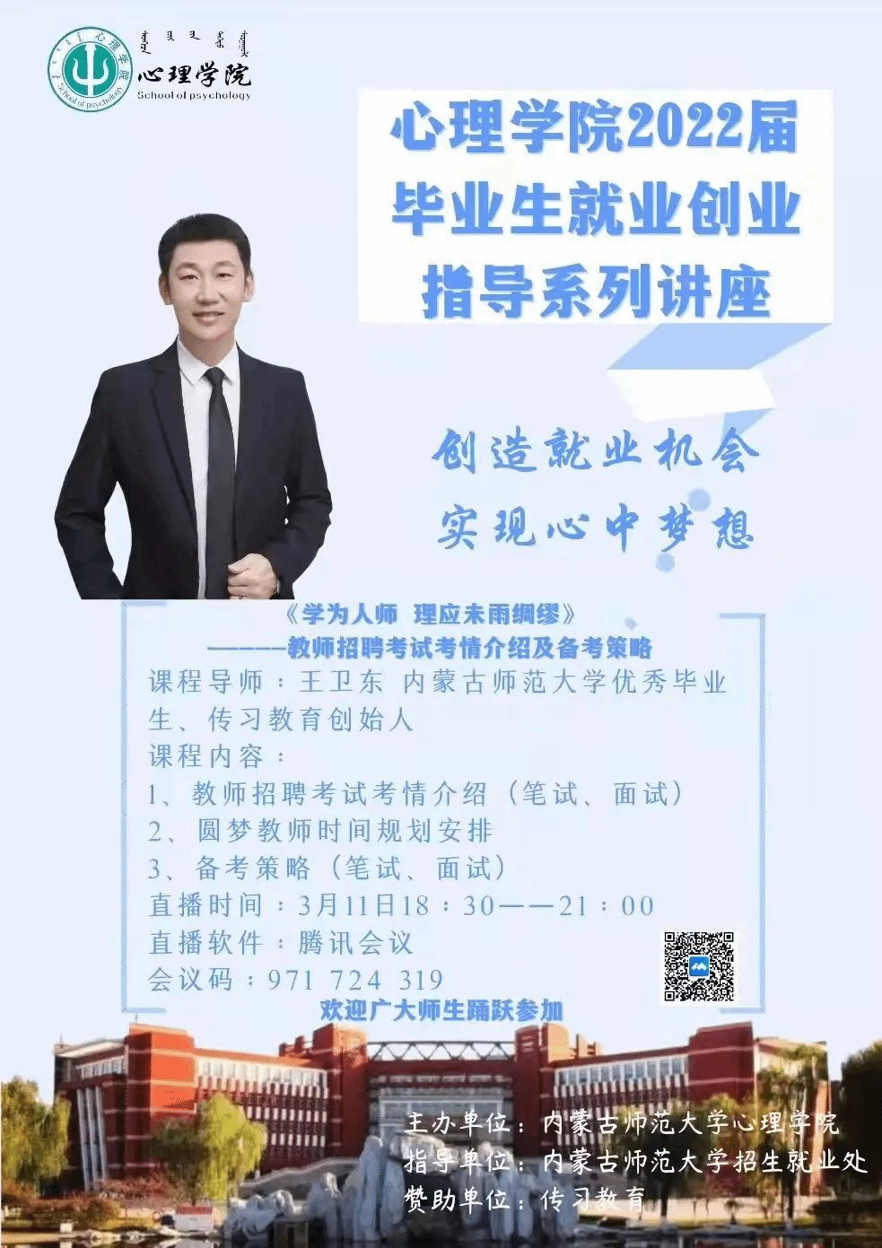 为贯彻党中央、国务院“稳就业”“保就业”决策部署,落实学校推进毕业生就业工作要求,促进bat365官网毕业生高质量就业。2022年3月11日,bat365官方官网特邀请优秀校友、传习教育创始人王卫东为同学们开展“《学为人师 理应未雨绸缪》--教师招聘考试考情介绍及备考策略”专题讲座,学院党委副书记副院长张晓阳参会,学生工作与就业指导办公室主任张金钟主持。