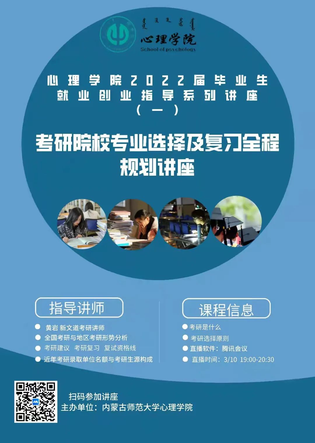 为丰富2019、2020级学生对考研的相关知识,激发学习热情、增强考研信心,bat365官方官网于2022年3月10日晚19点开展了2022届毕业生就业创业指导系列讲座(一)——考研院校专业选择及复习全程规划讲座。