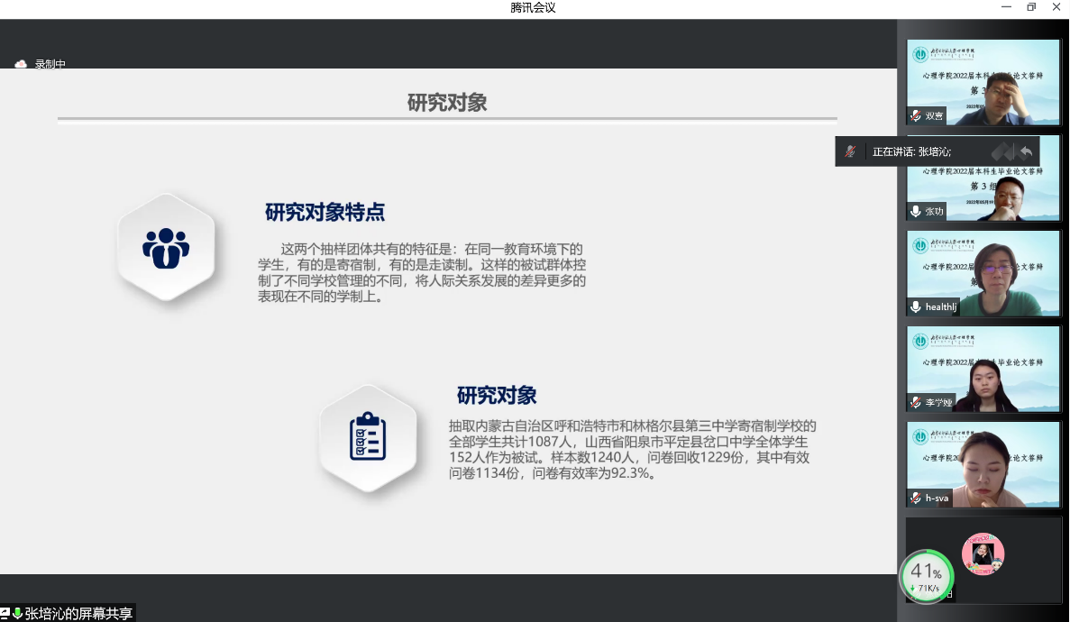 答辩中,同学们基本能运用所学理论知识,结合科学研究方法进行论证研究,反映出对所学专业的关注度与敏感度,语言文字表达规范、流利、清晰,初步具备了科研能力。答辩委员会针对同学们的网上汇报和答辩提出了专业性的指导。线上答辩过程井然有序。