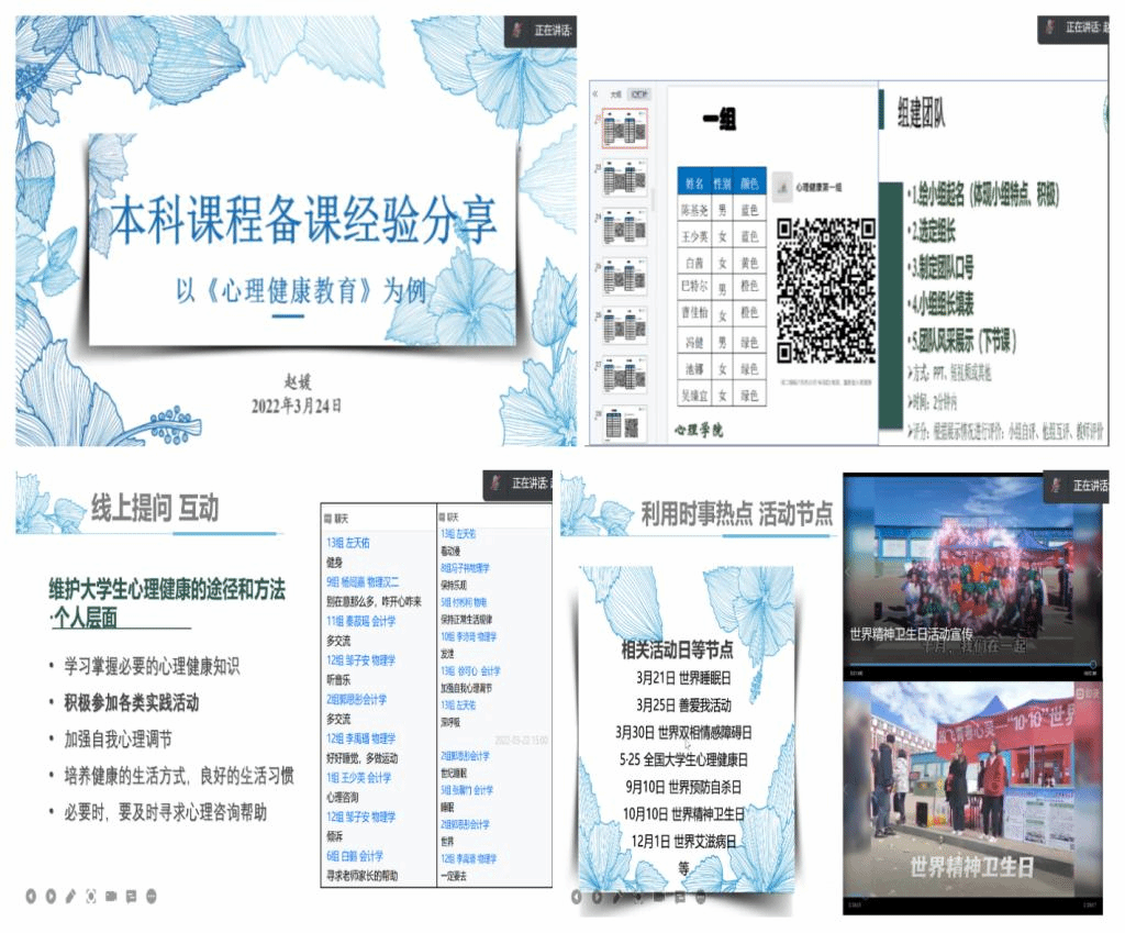 赵媛老师从组建和发挥团队功能、加强互动交流提供发言机会、利用热点时事注重启发教育等三个方面对公共课《心理健康教育》的备课经验做了分享。为了课程效果最大化,在课前组建小组,课中互动热身、布置任务、线上提问、创造小组互动的机会,并利用相关活动日等节点进行健康教育。根据学生的专业特点,利用时事热点事件,启发学生进行深刻思考,分享感悟,做出正确引导,使学生掌握心理健康知识,积极参加各类实践活动,加强自我心理调节,培养健康的生活方式,良好的生活习惯,维护大学生的心理健康。