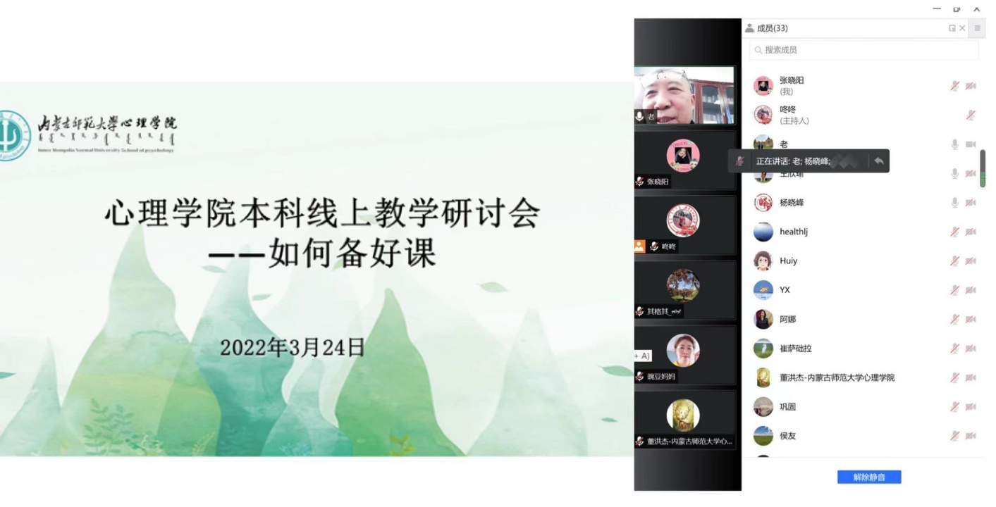 为了进一步提升线上教学效果,促进本科教学质量,3月24日下午,在各教研室充分开展线上教学研讨的基础上,bat365官方官网召开“如何备好课”——本科线上教学研讨会。学院党委书记七十三、院长乌云特娜、党委副书记张晓阳、副院长侯友及全体教师参加。心理学系主任杨晓峰、中学教育心理学教研室主任解翠玲、职业教育心理学教研室主任董洪杰、心理健康教育教研室主任赵媛分别做了经验交流和分享。