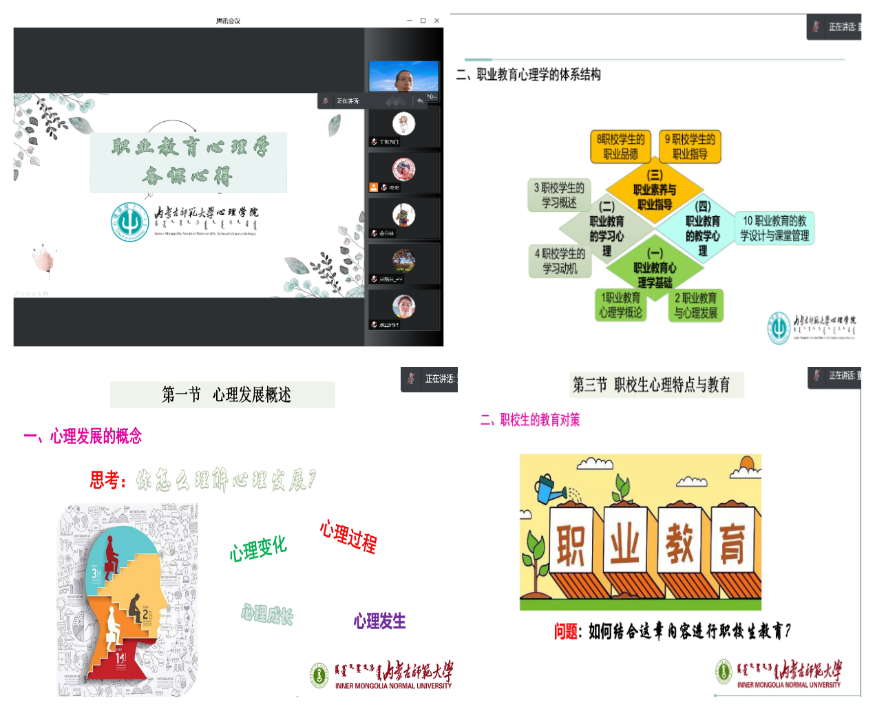 董洪杰老师将《职业教育心理学》的备课思路从情境导入、思政融入、专业产出等三个方面做了介绍。梳理章节之间的逻辑联系,从职业教育心理学基础、职业教育的学习心理、职业素养与职业指导、职业教育的教学心理等方面介绍了职业教育心理学的知识体系结构。并从心理变化、心理成长、心理过程、心理发生等方面将职校生的心理特点与课程内容相结合进行职业教育。