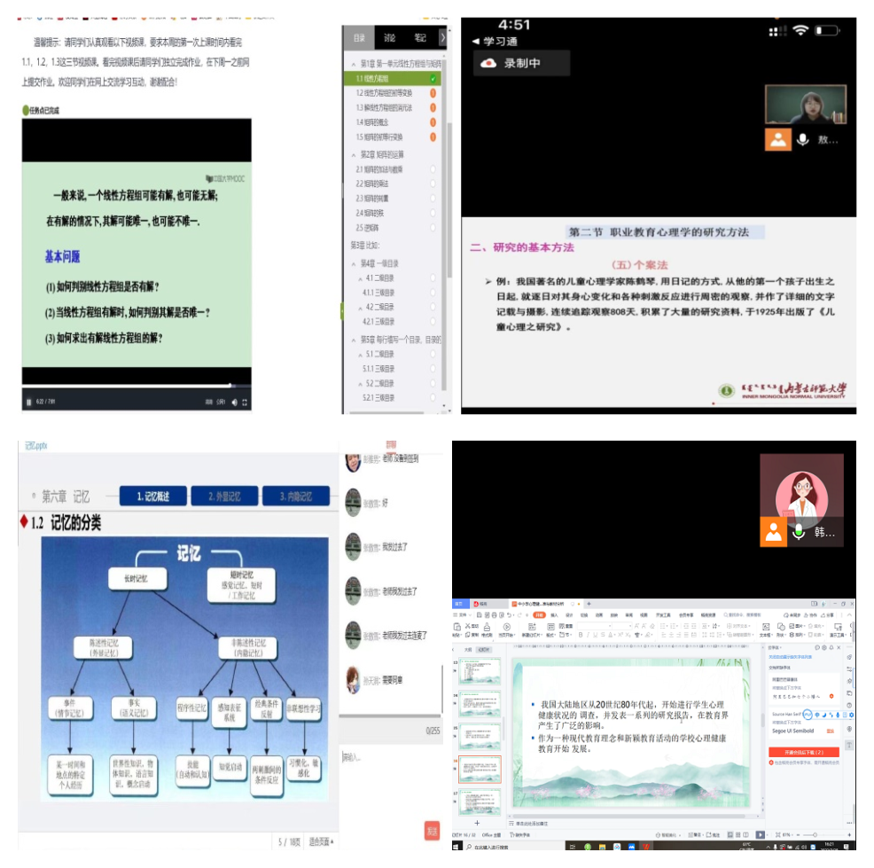 开学第一天,bat365官网共有11门本科课程,3门研究生课程顺利开课,教师们充分利用“内师在线”教学平台,选取优质教学资源,采用视频直播等方式,辅助微信、腾讯会议、QQ群等进行课堂教学、辅导和在线答疑;学生们积极参与线上学习和讨论;学院领导和教学督导深入到每门课堂进行听课指导,保障教学质量;以良好的精神面貌给新学期开了个好头。
