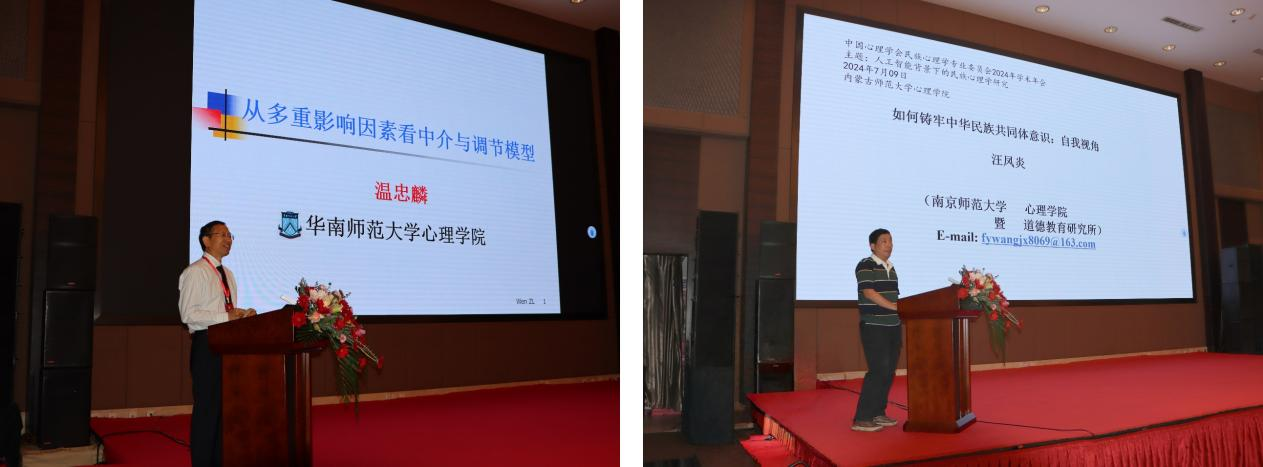 开幕式后,华南师范大学温忠麟教授、南京师范大学汪凤炎教授、上海交通大学李卫东教授、浙江大学周宵研究员和bat365官方官网王欣瑜教授分别就《从多重影响因素看中介与调节模型》、《如何铸牢中华民族共同体意识:自我视角》、《AI 与脑机交互技术在抑郁中的探索研究》、《青少年创伤心理的变化特征及代际影响》和《深层文化结构视阈下的中国心理学本土化省思》等议题做了五场特邀报告,分享了民族心理学国内前沿科研成果和实践经验,为与会者奉献了一场高水平的饕餮盛宴。