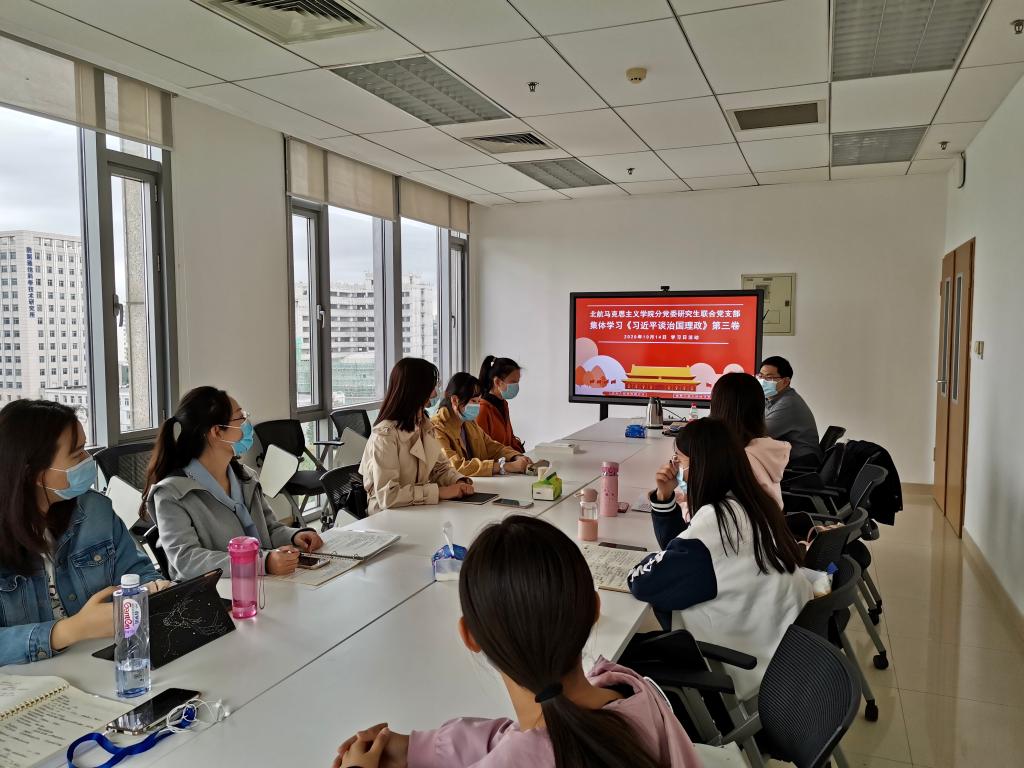 为全面深入学习贯彻落实习近平新时代中国特色社会主义思想和党的十九大及十九届二中、三中、四中全会精神,学深悟透《习近平谈治国理政》第三卷,bat365在线中国登录入口研究生党支部于10月14日组织开展了以集中学习《习近平谈治国理政》第三卷为主题的“马院青年原著读书会”党日活动。党支部副书记陈思康同志向大家传达了《中央宣传部、中央组织部关于认真组织学习<习近平谈治国理政>第三卷的通知》,并强调支部全体成员要认真学习深刻领会其中精神,要发挥学科专长,阅读经典原著,将马克思主义原理与实际相联系,始终坚持以习近平新时代中国特色社会主义思想为行动指南。