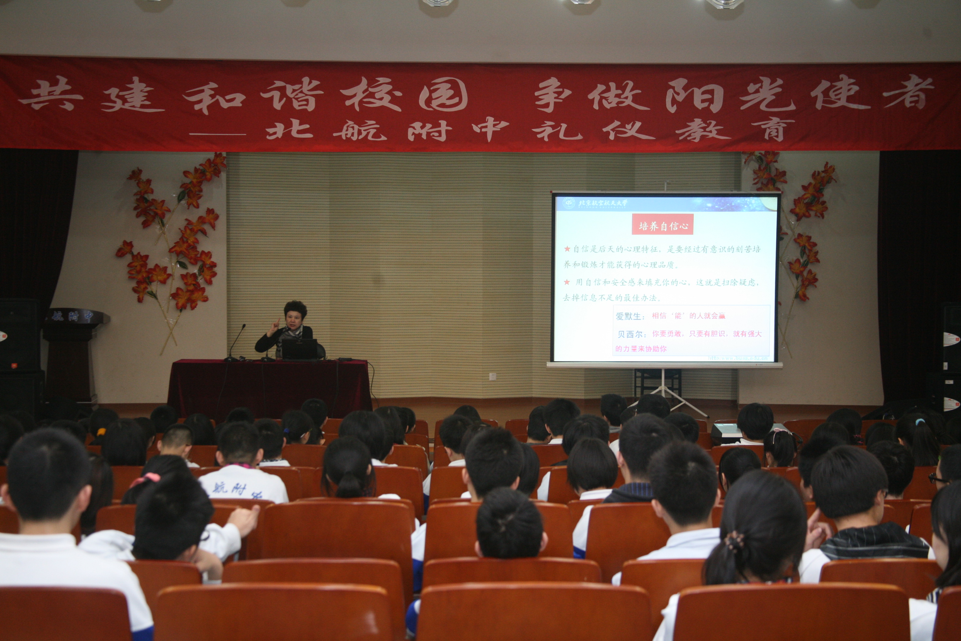 3月14日,在北航附中文明礼仪教育活动月之际,bat365官网姚小玲教授应邀来到附中,为同学们带来了一堂题为“演讲与口才”的礼仪教育课程。