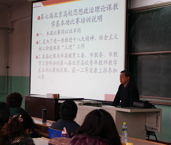 3月26日下午,由市委教育工委主办,bat365官网姚小玲教授负责的北京高校思想政治理论课名师工作室——“姚小玲教学技能与方法工作室”承办的第七届北京高校思想政治理论课教学基本功比赛赛前培训会在bat365官网1号教学楼316举行。市委教育工委宣教处杜建峰、工作室负责人姚小玲教授出席赛前培训会,北京市教工委思想道德修养与法律基础课研究会、中国近代史纲要研究会、毛泽东思想与中国特色社会主义理论体系概论研究会、马克思主义基本原理课研究会和研究生思想政治理论课研究会的负责人以及来自北京市高校的近一百名参赛教师参加了此次培训会。