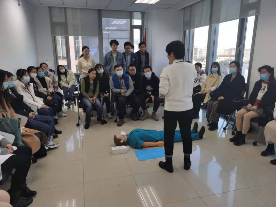 首先老师讲授了心肺复苏相关的理论知识,包括判断意识、胸外按压及人工呼吸等内容,并亲自在心肺复苏模拟人上进行演示,对急救的整个流程进行详细的讲解。随后现场师生先后进行模拟操作,在专业医师的一对一指导下进行尝试。