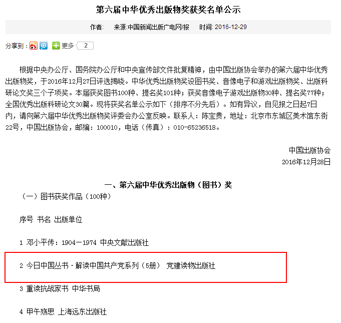 据悉,第六届中华优秀出版物奖设图书奖、音像电子和游戏出版物奖、出版科研论文奖三个子项奖。本届获奖图书100种、提名奖101种;获奖音像电子游戏出版物30种、提名奖77种;全国优秀出版科研论文30篇。该奖项是由中国出版协会主办,评选结果由中央办公厅、国务院办公厅和中央宣传部文件批复,经过向社会公示,于2017年4月23日“世界读书日”正式揭晓。